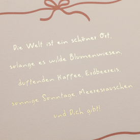 Die Welt ist ein schöner Ort, solange es wilde Blumenwiesen, duftenden Kaffee, Erdbeereis, sonnige Sonntage, Meeresrauschen und Dich gibt!