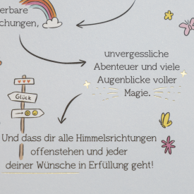 Zum Geburtstag wünsche ich dir: Jeden Tag einen Grund zum Lächeln, besondere Begegnungen, farbenfrohe Zeiten und Sonne im Herzen, Arme, die dich auffangen, wunderbare Überraschungen, unvergessliche Abenteuer und viele Augenblicke voller Magie. Und dass dir alle Himmelsrichtungen offenstehen und jeder deiner Wünsche in Erfüllung geht!