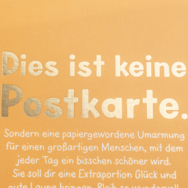 Dies ist keine Postkarte. Sondern eine papiergewordene Umarmung für einen großartigen Menschen, mit dem jeder Tag ein bisschen schöner wird. Sie soll dir eine Extraportion Glück und gute Laune bringen. Bleib so wundervoll, wie du bist - die Welt braucht mehr Menschen, die so sind wie du!
