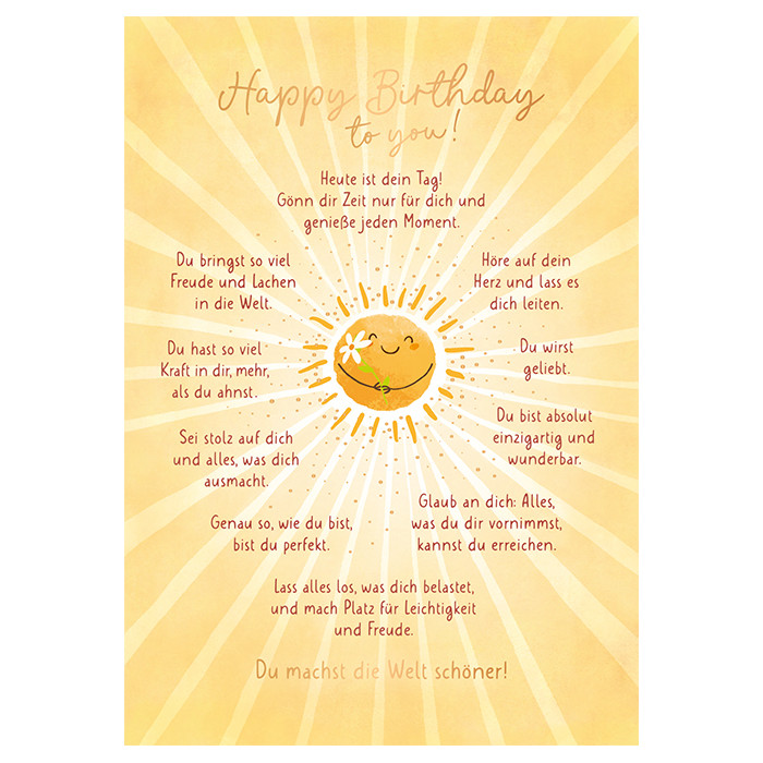 Happy Birthday to you! Heute ist dein Tag! Gönn dir Zeit nur für dich und genieße jeden Moment. Du bringst so viel Freude und lachen in die Welt. Du hast so viel Kraft in dir, mehr, als du ahnst. Sei stolz auf dich und alles, was dich ausmacht. Genau so, wie du bist, bist du perfekt. Lass alles los, was dich belastet, und mach Platz für Leichtigkeit und Freude. Höre auf dein Herz und lass es dich leiten. Du wirst geliebt. Du bist absolut einzigartig und wunderbar. Glaub an dich: Alles, was du dir vornimmst, kannst du erreichen. Du machst die Welt schöner!