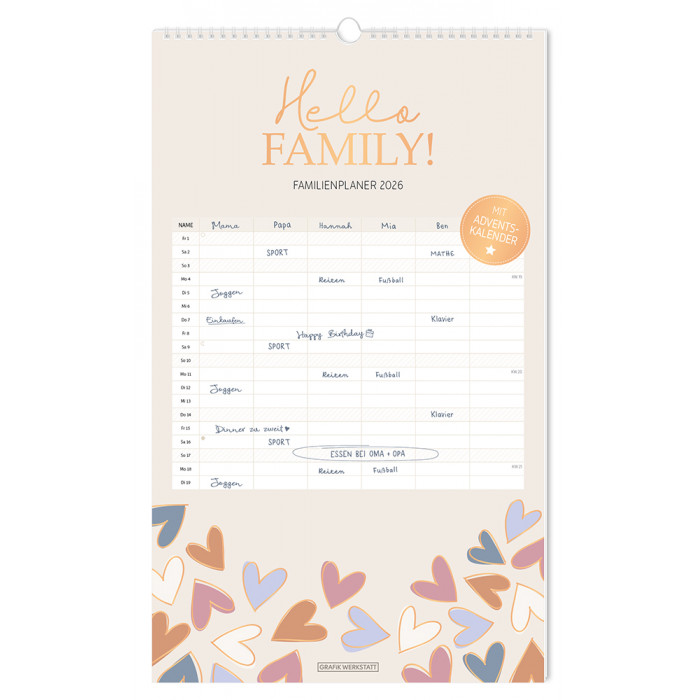 Mit diesem Familienkalender ist das tägliche Miteinander gut organisiert: Jeder erhält seine eigene Spalte für persönliche Eintragungen - so kann die ganze Familie wunderbar planen. Der farbenfrohe Kalender schenkt zudem jeden Monat positive Impulse und ein inspirierendes Familien-Motto für ein glückliches Zusammenleben! Inkl. 6 extra breiten Spalten für persönliche und gemeinsame Termine! • Format: 29 x 48 cm Kleines Extra: Der Planer enthält einen farbenfrohen Adventskalender