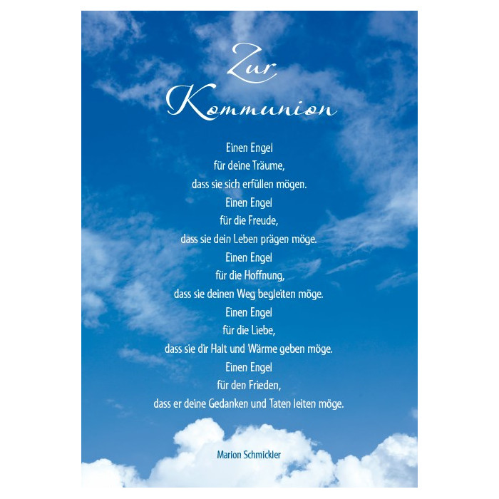 Einen Engel für deine Träume, dass sie sich erfüllen mögen. Einen Engel für die Freude, dass sie dein Leben prägen möge. Einen Engel für die Hoffnung, dass sie deinen Weg begleiten möge. Einen Engel für die Liebe, dass sie dir Halt und Wärme geben möge. Einen Engel für den Frieden, dass er deine Gedanken und Taten leiten möge.