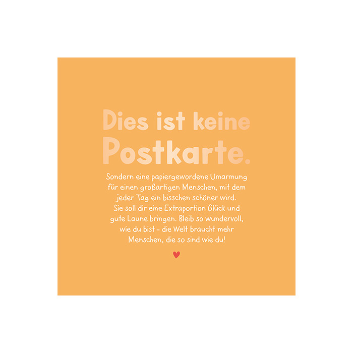 Dies ist keine Postkarte. Sondern eine papiergewordene Umarmung für einen großartigen Menschen, mit dem jeder Tag ein bisschen schöner wird. Sie soll dir eine Extraportion Glück und gute Laune bringen. Bleib so wundervoll, wie du bist - die Welt braucht mehr Menschen, die so sind wie du!